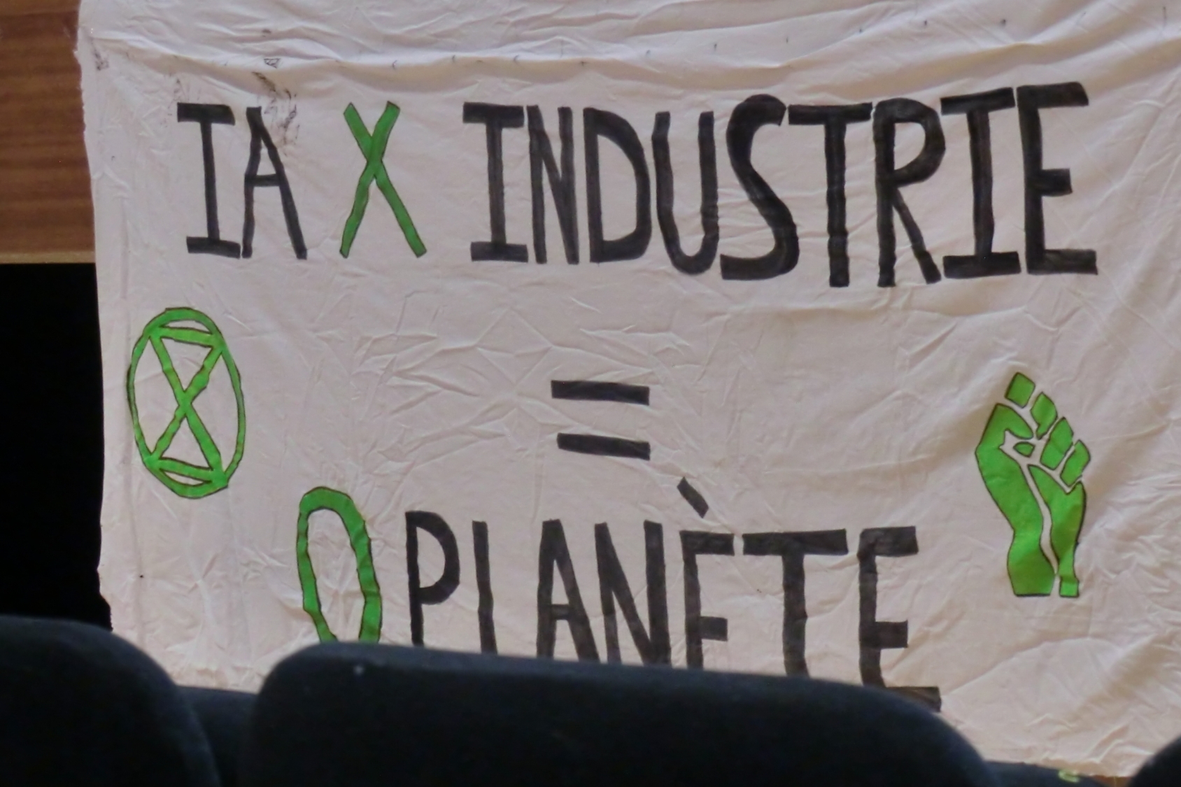 Paris, February 2025. Banner attached to the stage at the Anti-AI summit organized by anti-tech resistance in the Annexe de la bourse du travail: "IA x industry = 0 planet". The meeting could not take place in its original location and had been quickly moved to this venue. Later, in Grenoble, we start to understand more of the tensions around this group. Their anti-tech approach is based in an essentialist understanding of nature, at times anti-feminist, and bleeding into anti-trans statements.