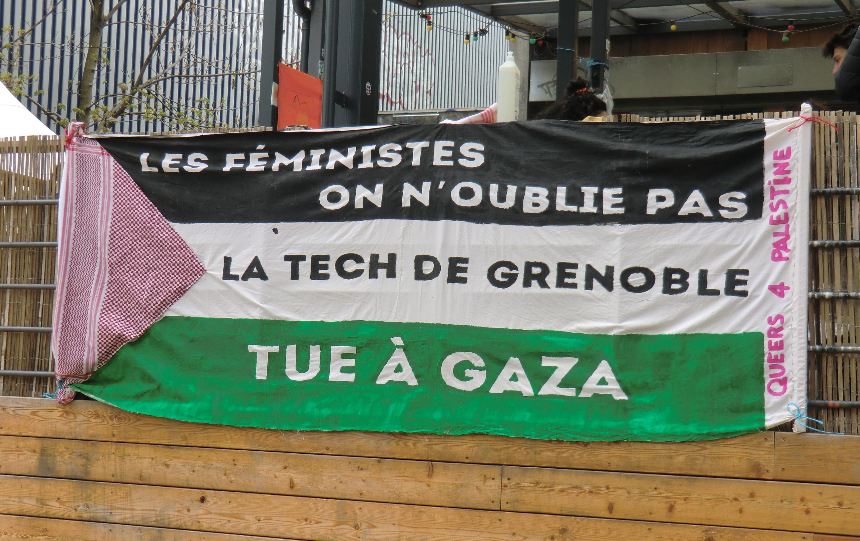 Grenoble, March 2025. On the outside of the temporary open air kitchen, this banner: Feminists do not forget / Tech made in Grenoble / Kills in Gaza / Queers 4 Palestine. Three days of action against the extension of a chip factory include the work of bringing together local and global struggles. Using all means possible, activist make an effort at solidarity on multiple scales. It included preparing over a thousand vegan sandwiches to take with us on the march.
